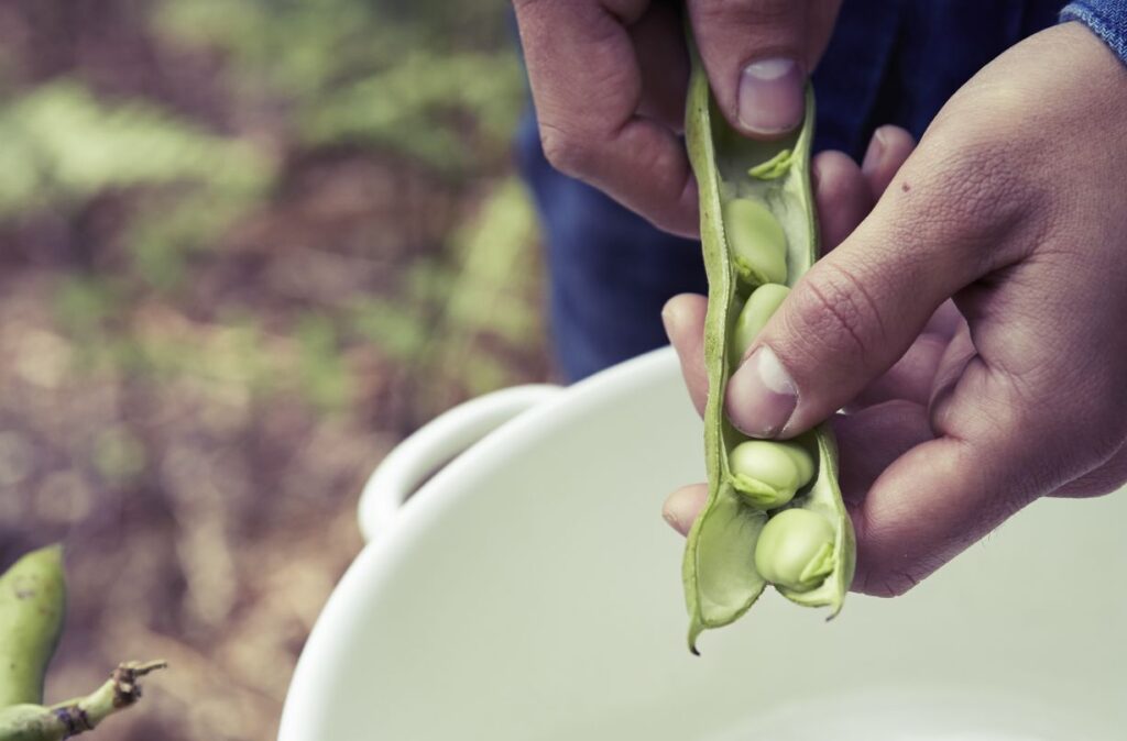 As broad beans have two cases to remove this process is called ‘double podding’. Start by removing the beans from the pods. Open the pods and use your thumb to push out the beans.
